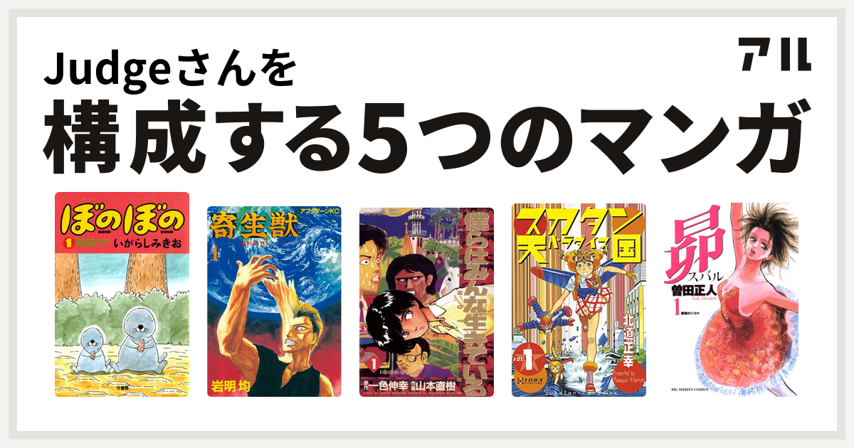 Judgeさんを構成するマンガはぼのぼの 寄生獣 僕らはみんな生きている スカタン天国 昴 私を構成する5つのマンガ アル